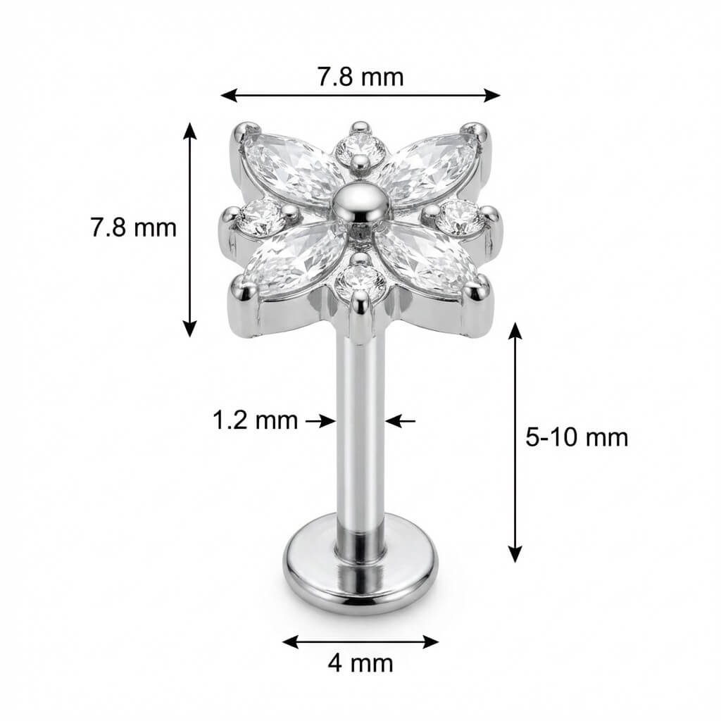 Lass deinen Look aufblühen! Dieses wunderschöne Blumen-Design funkelt mit einer edlen Kombination aus Marquise- und runden Kristallen, die bei jeder Bewegung strahlen. Es ist das perfekte Highlight für dein Helix, Tragus oder Lobe Piercing. Da es aus hochwertigem Titan gefertigt ist, kannst du dich auf beste Hautverträglichkeit und Langlebigkeit verlassen. Hol dir diesen funkelnden Hingucker für dein Ear-Party-Setup.
