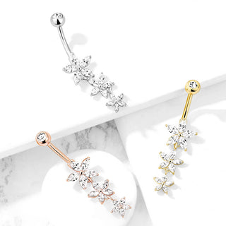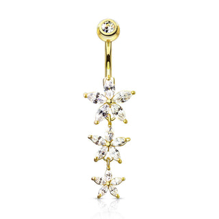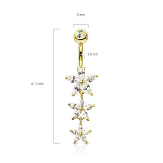 Immergiti nel fascino senza tempo di questo elegante piercing per ombelico, un connubio perfetto tra raffinatezza e brillantezza. Realizzato in ottone di alta qualità, questo gioiello è disponibile in tre affascinanti colorazioni: argento, oro e oro rosa, ciascuna abbinata a scintillanti pietre di zirconia cubica trasparente. La struttura è impreziosita da un incantevole pendente a forma di tre fiori, con cinque petali di zirconia marquise che catturano la luce in ogni movimento, garantendo un effetto luminoso e distintivo.