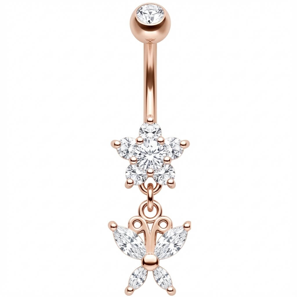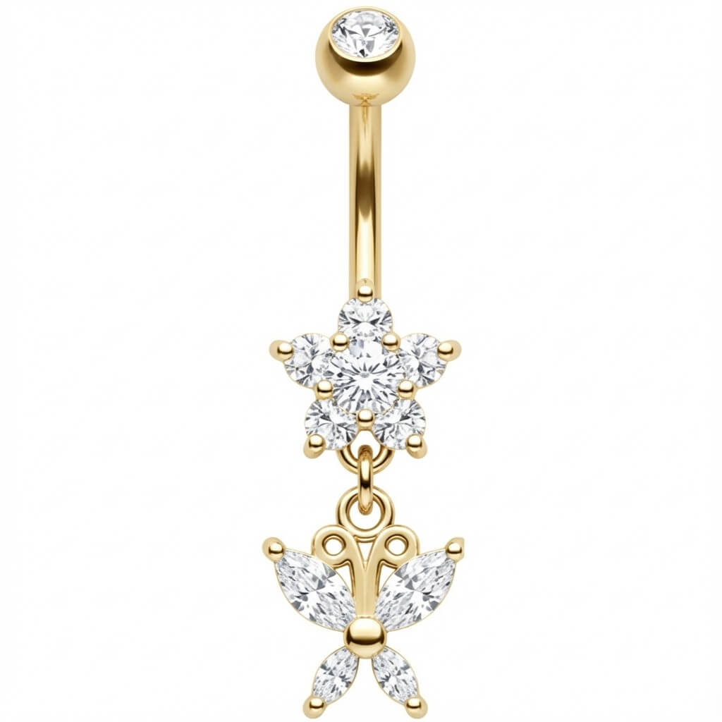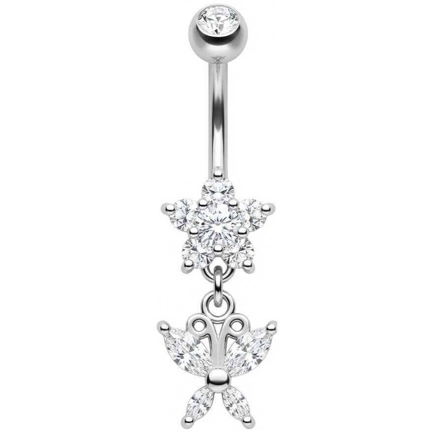 Get ready to shine! This stunning piece features a sparkling crystal flower with a delicate dangling butterfly that catches the light with every move. Crafted from high-quality 316L Surgical Steel, it is the ultimate sexy accessory for your summer vibes. Whether you are hitting the beach or a festival, this eye-catcher is a must-have to highlight your navel.