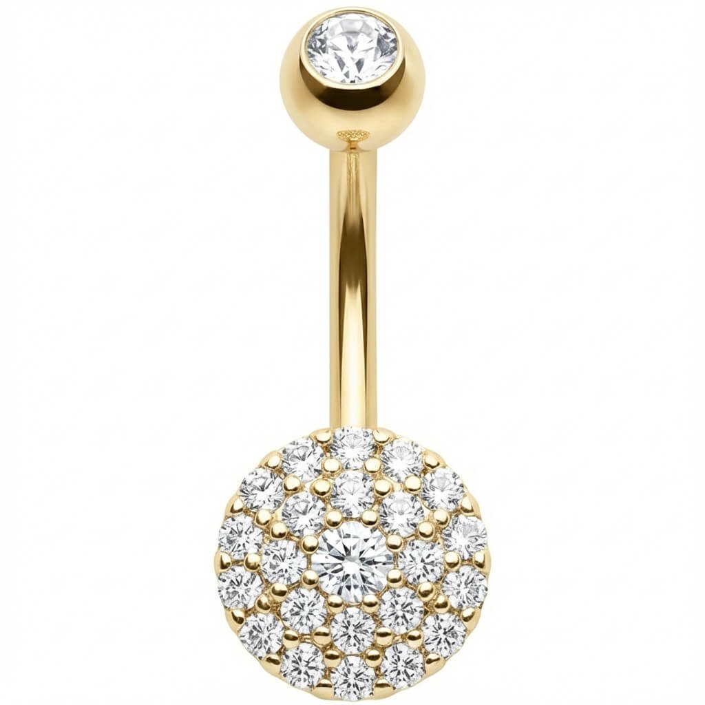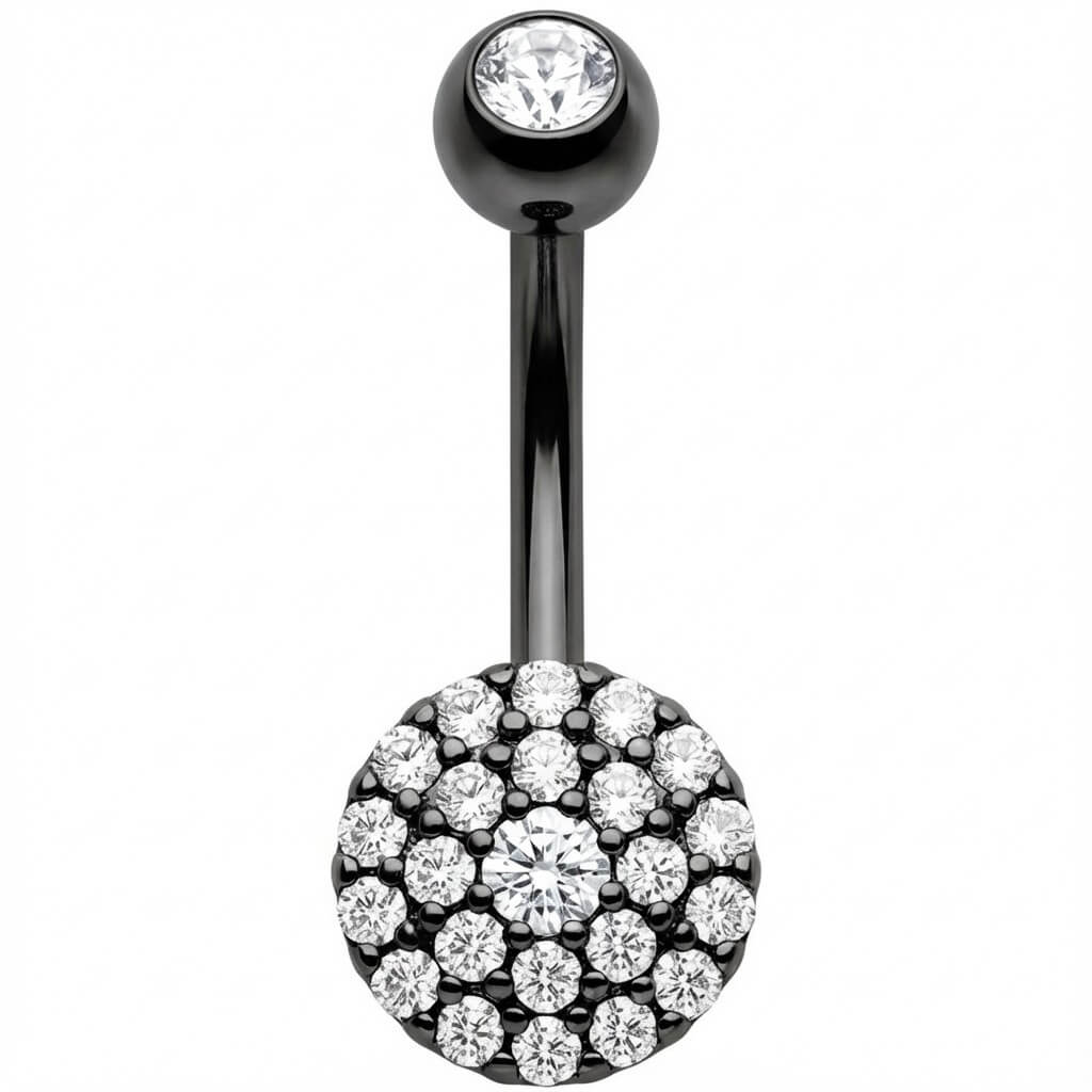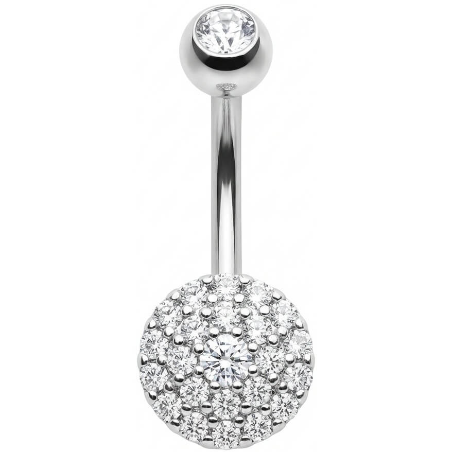 Get ready to shine! This stunner features a gorgeous round disc completely paved with sparkling crystals that catch the light from every angle. It is the ultimate eye-catcher for your navel, bringing that sexy summer vibe right to your look. Crafted from high-quality 316L Surgical Steel, it is durable and skin-friendly. Perfect for showing off that midriff!