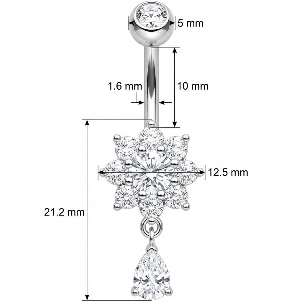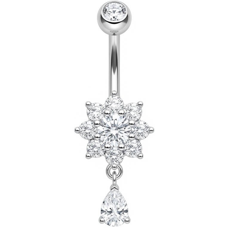 Get ready to shine this summer! This stunning belly button ring features a sparkling crystal flower design with an elegant teardrop dangle that catches the light with every move. It is the ultimate sexy eye-catcher for your navel, perfect for beach days or pairing with your favorite crop tops. Made from high-quality 316L Surgical Steel, it offers both durability and style. Upgrade your look with this dazzling accessory now!