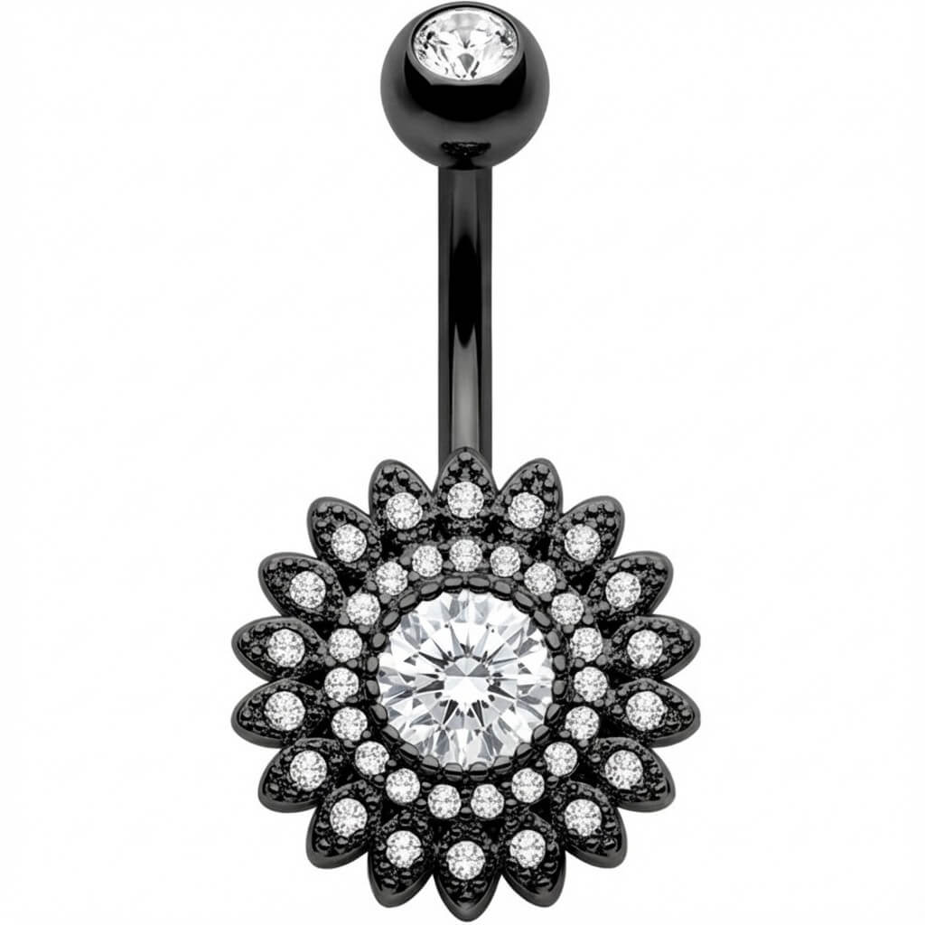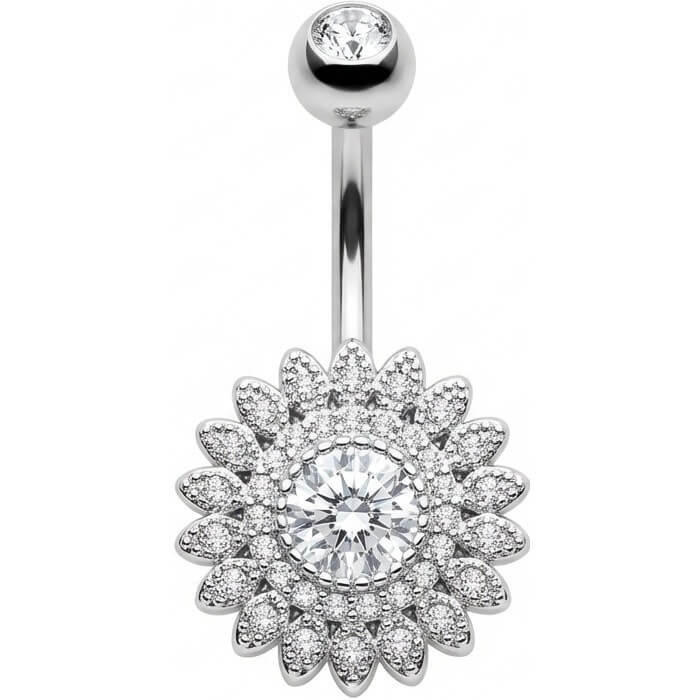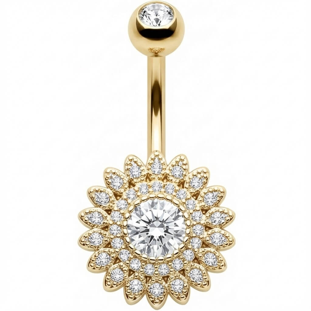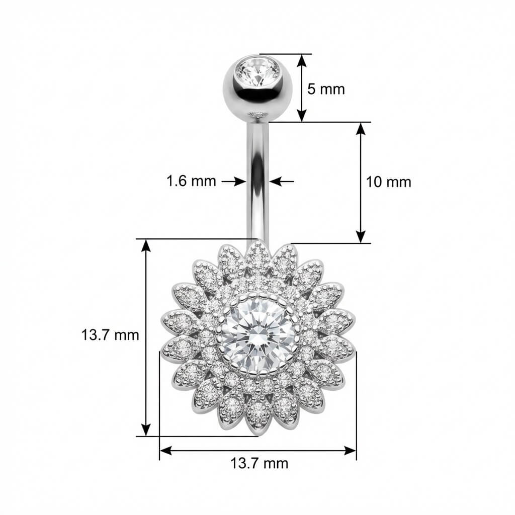 Get ready to glow! This stunning navel accessory features a gorgeous sunflower design completely paved with sparkling crystals. It is the ultimate eye-catcher for your summer look, bringing that sexy beach vibe right to your midriff. Crafted from high-quality 316L Surgical Steel, it is durable and skin-friendly. Perfect for showing off your style!
